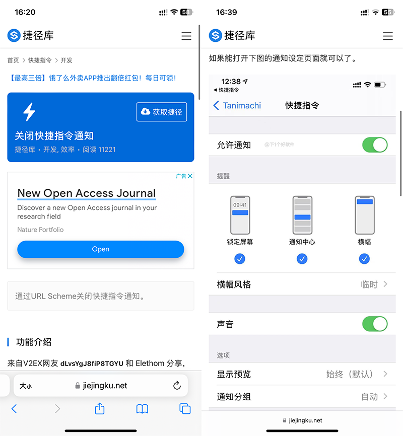 但是这种方式有弊端,体验并不好。现在有网友发现了全新的方法,同样是利用快捷指令,不过是采用了 URL Schemes 跳转的方法。先看看效果: