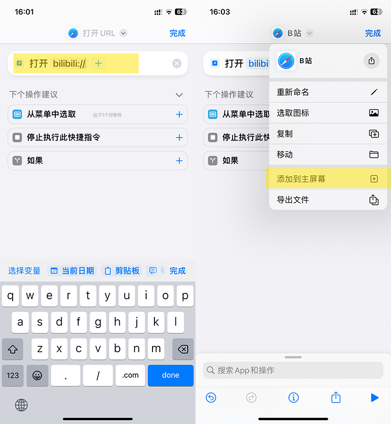 接下来找应用的 URL Schemes 地址,B 站的是:bilibili://,点击 URL 地址,填写上。其它 APP 应用你可以通过搜索引擎来查找,例如:应用名 + URL Scheme,然后点击添加到主屏幕。