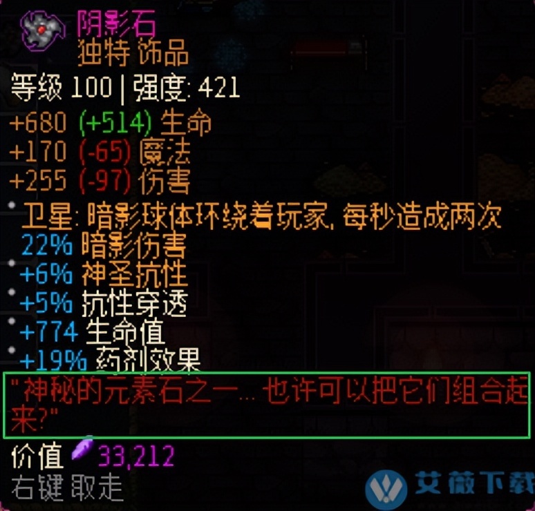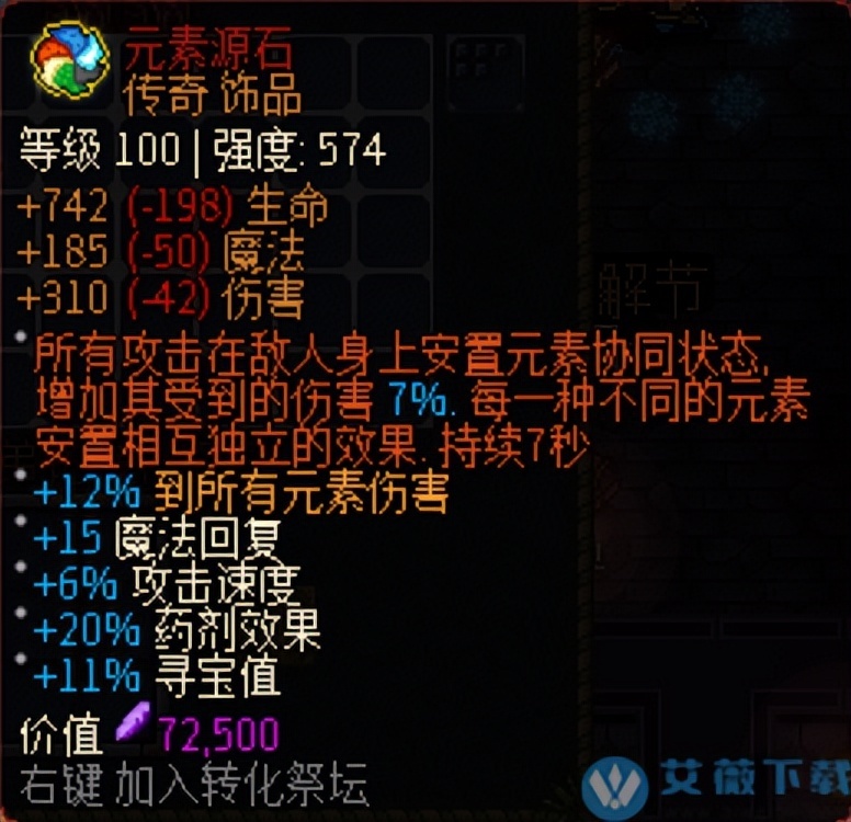 元素石分别是:光明石,冰霜石、毒素石、火焰石、阴影石、雷霆石六种,这六种石头下方都有一条相同的红色的字,六个集齐以后可合成一个传奇饰品,这个饰品只能合成获得,无法通过DU或者掉落获得。大部分玩某一元素伤害的BD都会选择这个元素源石,所以前期升级掉落了元素石最好是捡到来,丢仓库存着。