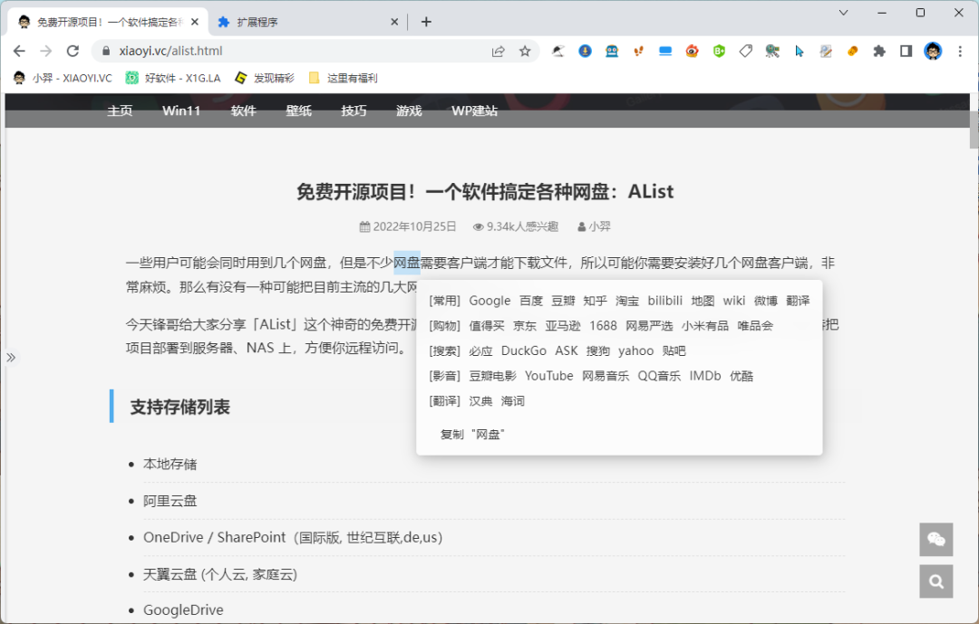 浏览器相信大多数人用最多的功能就是搜索,为了提高搜索效率,你可以借助这款「强悍搜索」扩展插件,它支持当你在网页选中任意文字时弹出一个悬浮菜单,内置各种常用搜索引擎,方便你搜索内容,同时也支持自定义网址。
