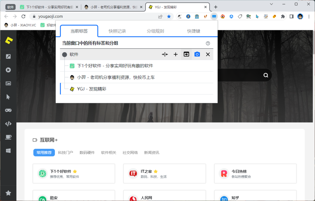 虽然 Edge / Chrome 浏览器自带了标签分组功能,如果你觉得它功能太弱的话,可以用「标签分组」扩展插件,它支持通过自定义匹配规则,为标签页自动创建分组。