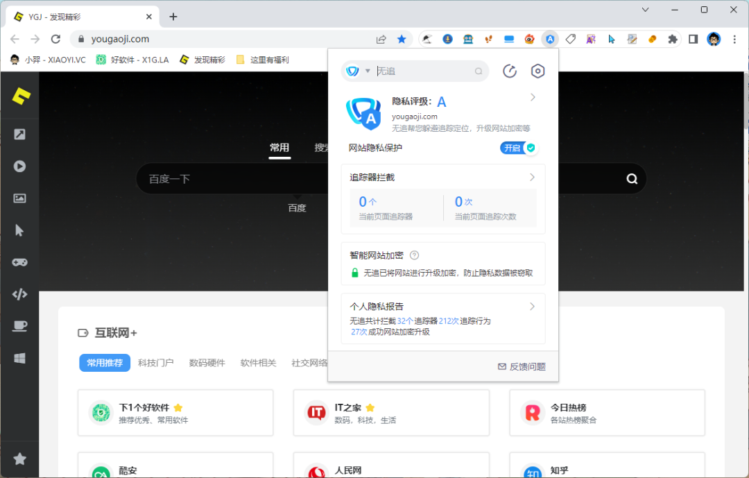这个「无追搜索」一个主打安全隐私的搜素引擎网站,集合国内外热门搜索引擎,通过它的扩展插件你可以摆脱网站大量追踪代码的跟踪,对网站多维度综合评级,网页隐私保护程度一目了然。