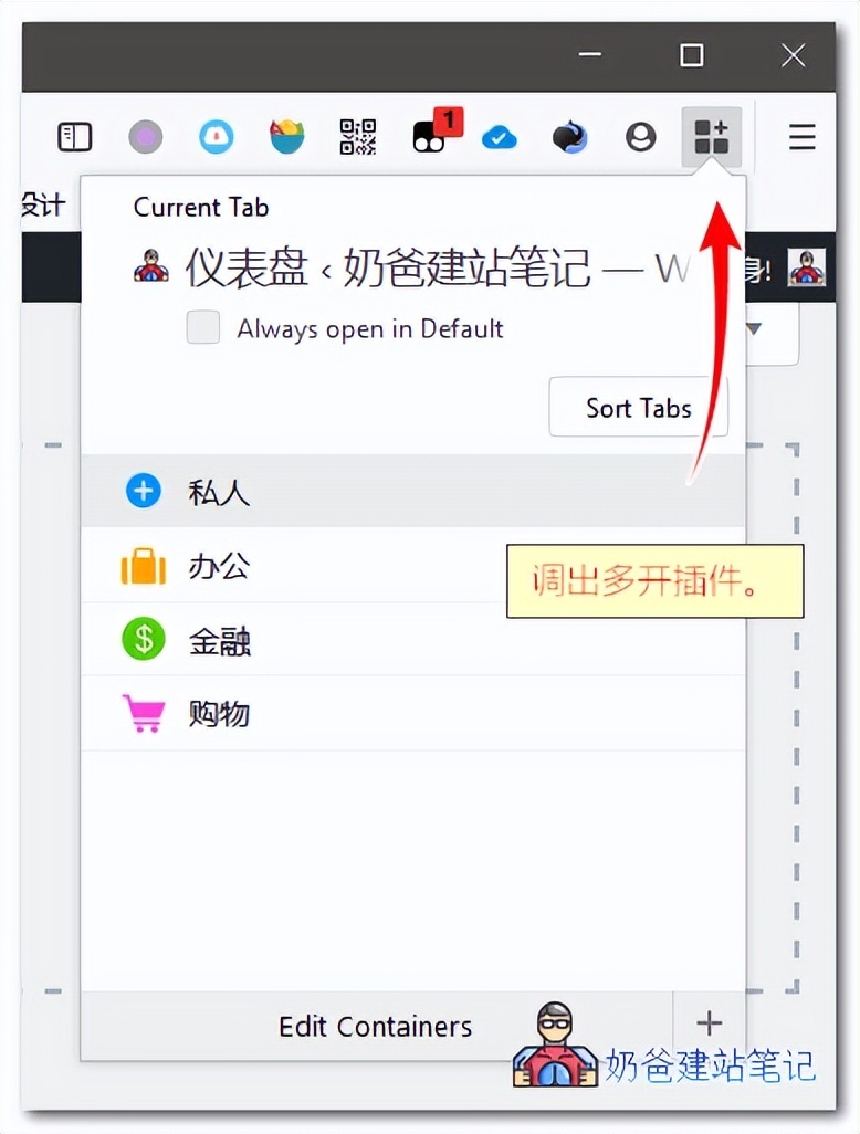 火狐扩展下载,安装好了后在右上角可以看到Firefox Multi-Account Containers的图标。