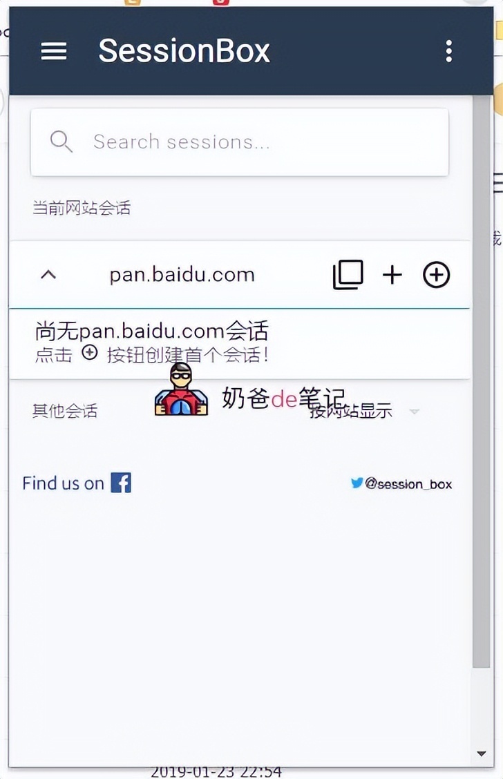 这里我用百度网盘为例,点击SessionBox图标后,如果你是临时使用多账号,可以点击后面不带⭕的+号,如果你是经常使用多账号,那么可以点击带⭕的加号创建一个存储规则,下次直接点击就行了。