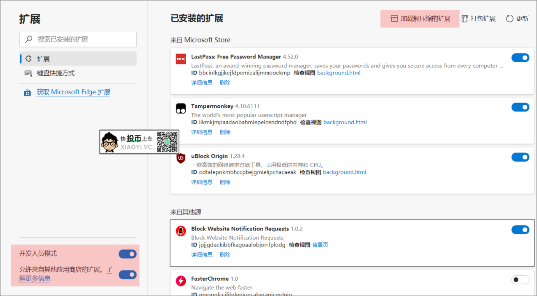 把下载的.crx扩展文件解压缩出来,然后「Edge」浏览器打开扩展页面 edge://extensions ,右下角开启 “允许来自其他应用商店的扩展” 和 “开发者模式”,接着点击 “加载已解压的扩展程序” 选择你解压出来的文件夹。
