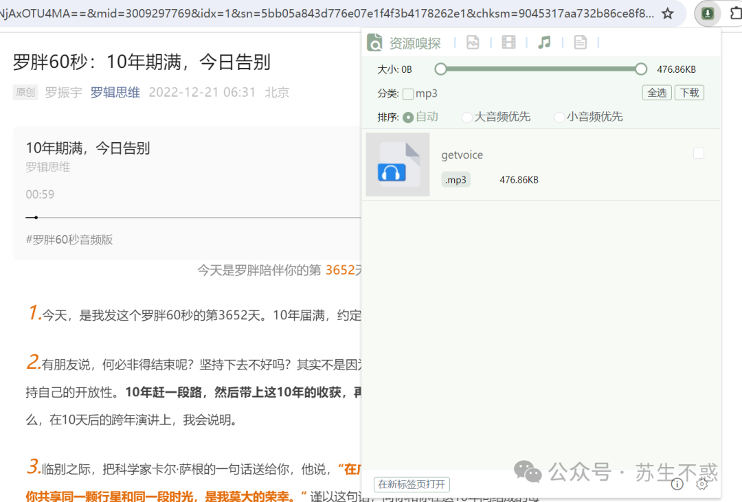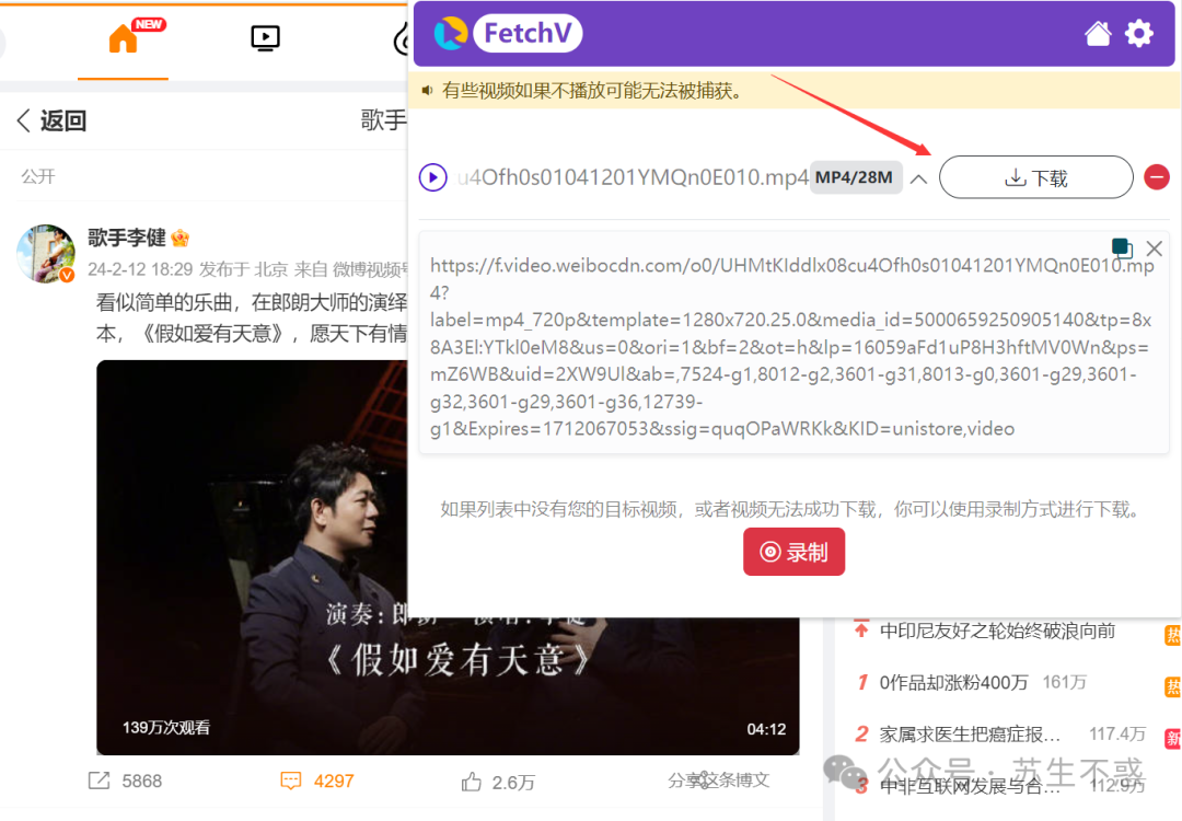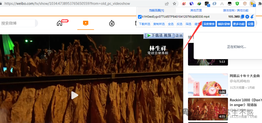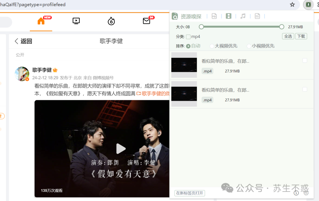 这是个音乐和视频资源嗅探神器https://github.com/xifangczy/cat-catch,2024年3月4日又更新了 https://chrome.google.com/webstore/detail/%E7%8C%AB%E6%8A%93/jfedfbgedapdagkghmgibemcoggfppbb,可以很方便的下载网页音频和视频,视频播放以后,点击浏览器右上角的猫抓图标,它就能自动呈现包含流媒体的链接了,比如微博视频: