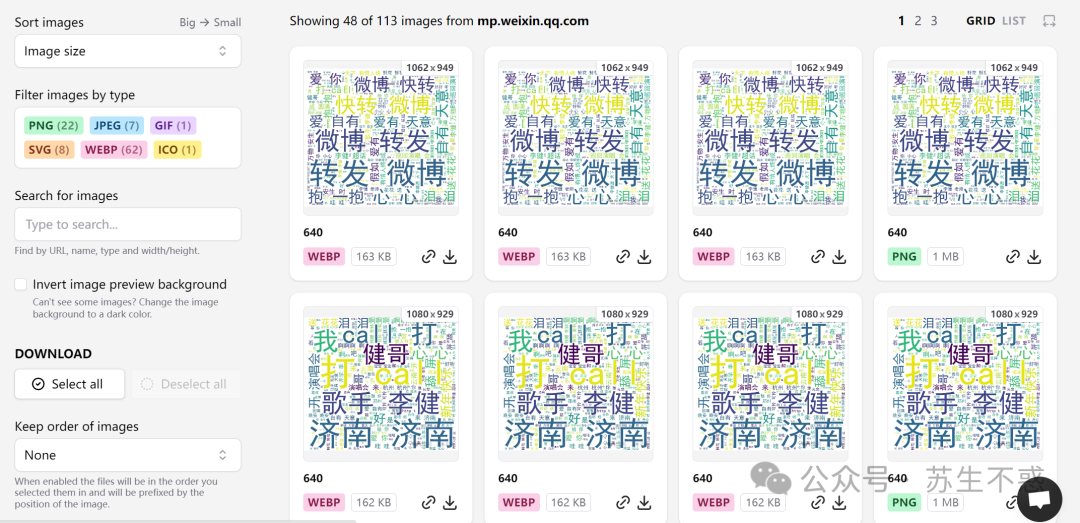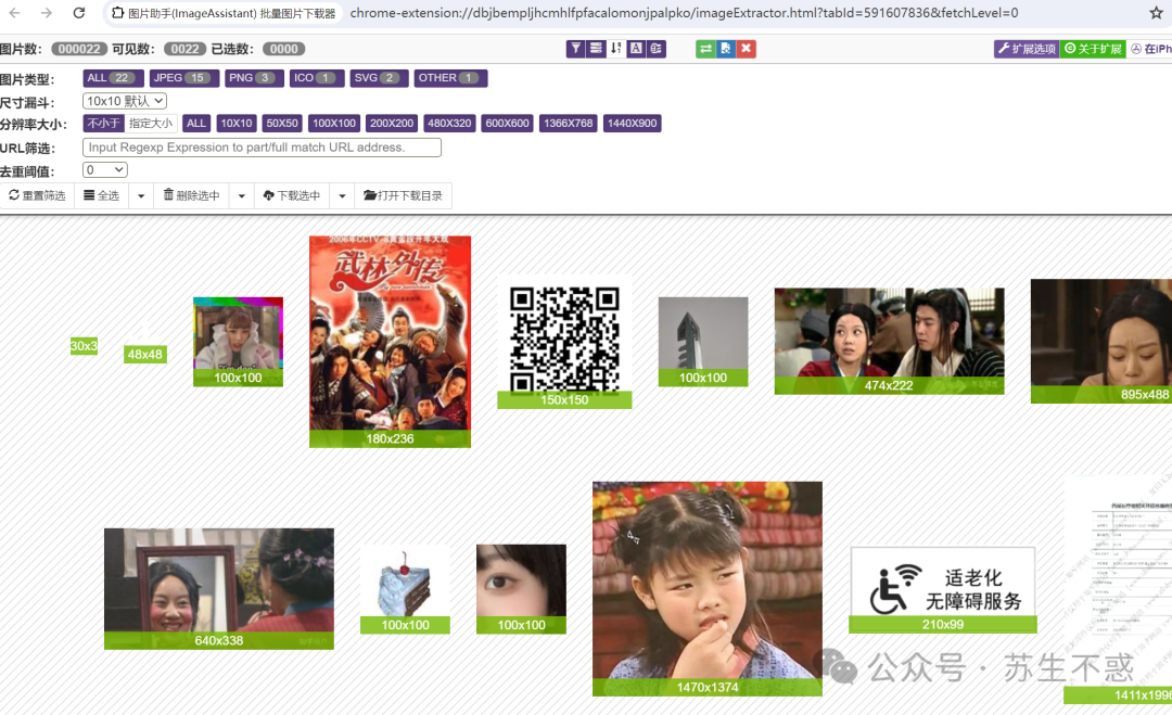 如果只是下载图片可以用批量图片下载器图片助手 ,一款用于嗅探、分析网页图片并提供批量下载等功能的浏览器扩展程序,可以按照图片类型,大小,分辨率和url筛选下载。