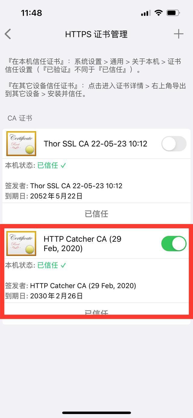 特别强调:总鼓捣的朋友都会这一步骤,新手朋友一定要注意,这里是2步,很多人都是只完成第一步,不去完成第二步,然后不好使就总抱怨出问题了,出现“未信任”字样的,请检查你第二个步骤:设置—>通用—>关于本机—>证书信任设置,这里是否信任了该证书。