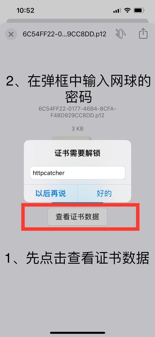 3、点击“查看证书数据”,随后在弹出的密码框里输入网球当中的密码,我不知道你们的是什么,反正我的是httpcatcher,输入完毕后点击“好的”。