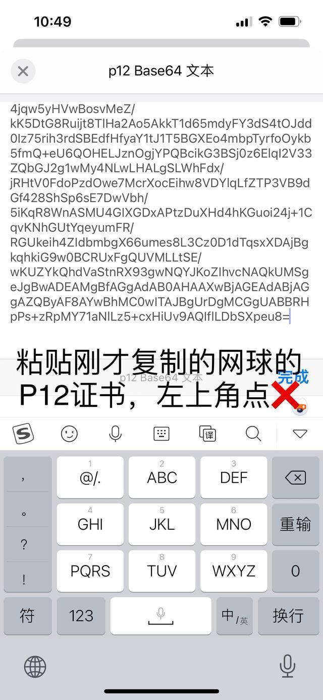 2、点击右上角“+”,选择第二项,“p12 Base64文本”,在弹出的界面粘贴入刚刚从网球复制过来的p12证书密文,然后点点左上角×关闭。