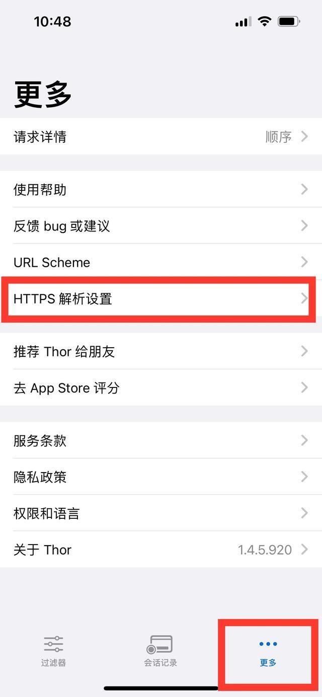 1、打开thor,右下角“更多”,点击“HTTPS解析设置”