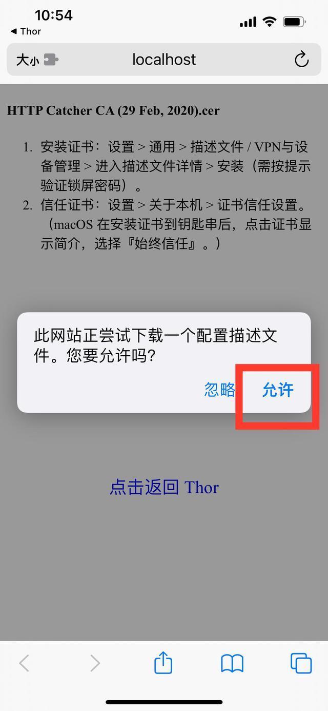 6、 允许,然后去手机设置—>通用—>VPN设备管理中选择对应的证书—>安装(输入锁屏密码)最后去手机设置—>通用—>关于本机—>证书信任设置,选择对应的证书,信任。