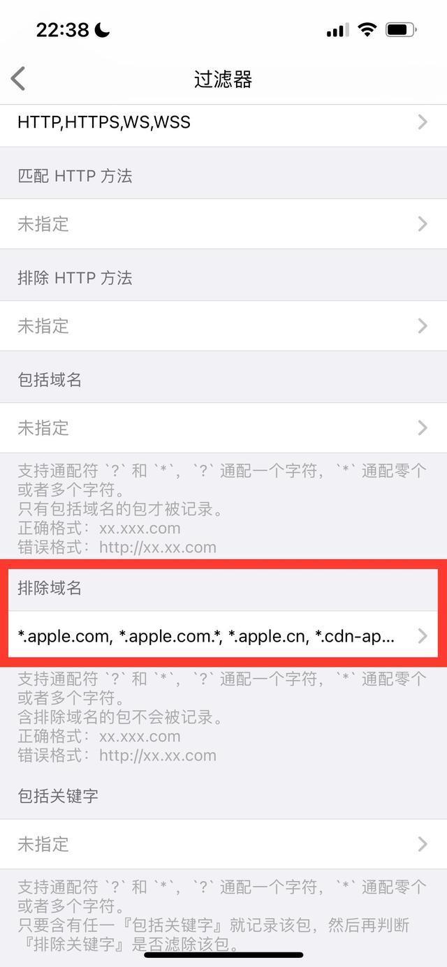 这里说一下排除域名的意思:就是抓包时,只要包含这些域名的网络数据包,通通都不记录。