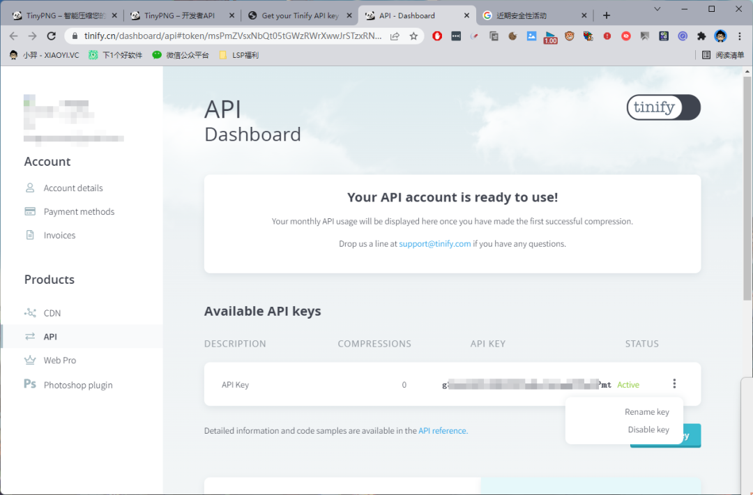 然后复制 API Key 粘贴到软件界面里面保存就可以了,现在支持 5MB 大小文件压缩了,每个 API 每月有 500 张图片免费额度,如果你不够用的话,再换个邮箱去申请 KEY 就好了。另外客户端支持压缩后直接替换原图的功能。