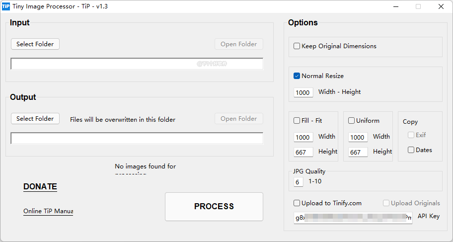 另外在官方网站里也有提供客户端软件「Tiny Image Processor」同样有输入 API Key 功能。功能上比「TinyGUI」多一些,支持设置图片分辨率、输出目录、JPG压缩率。不过锋哥感觉用起来还是没有「TinyGUI」简单快速方便。