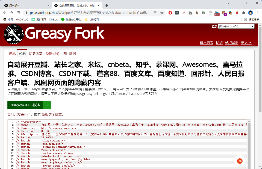 支持自动展开豆瓣、站长之家、米坛、cnbeta、知乎、慕课网、Awesomes、喜马拉雅、CSDN博客、CSDN下载、道客88等等网站,如果你有需要支持的网站也可以提交给脚本作者。