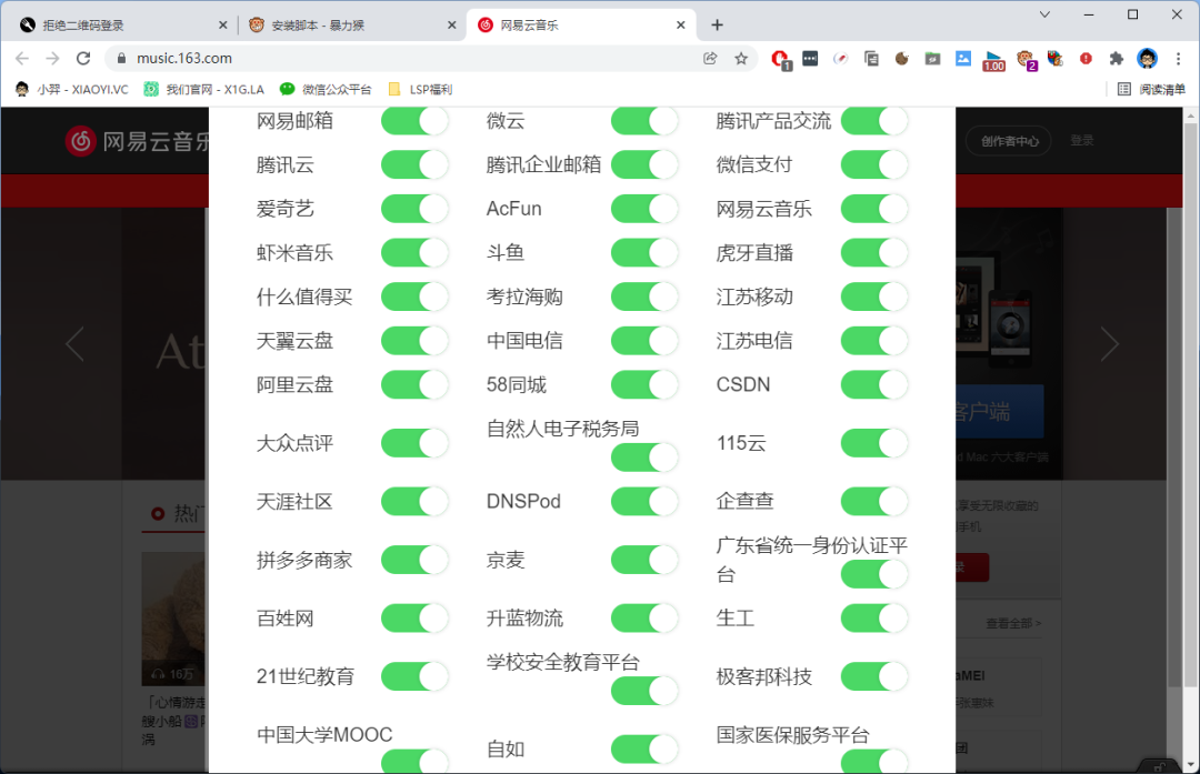 目前支持新版12306、京东、百度(包括百度、贴吧、文库等)、豆瓣、苏宁、知乎、支付宝、阿里云、QQ、网易邮箱、爱奇艺、AcFun、网易云音乐、虾米音乐、斗鱼、虎牙直播、什么值得买、考拉海购……等等网站。