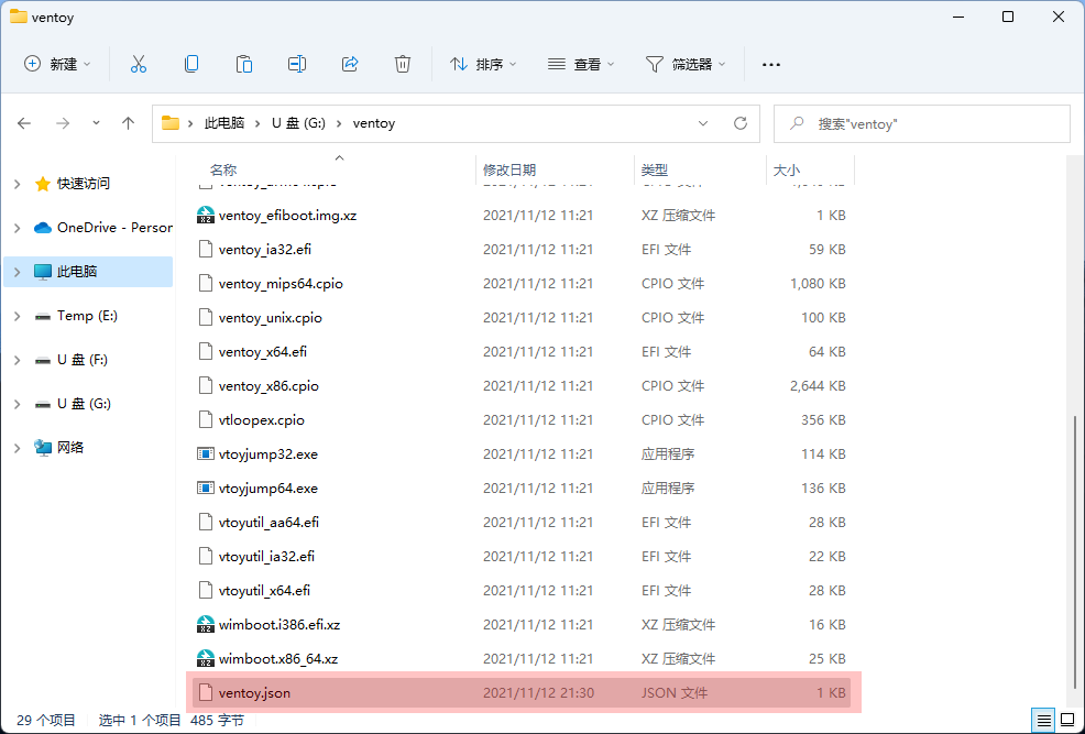 在 U 盘的 ventoy 目录创建一个名为 ventoy.json 的文件,可以用记事本创建,然后修改扩展名为 .json,接着添加下面的内容: