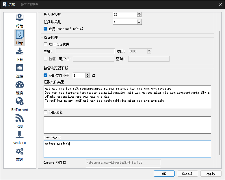 打开设置 – Http,找到 User-Agent,修改成 “softxm;netdisk” ,并把任务并发数(线程)修改成 “4” 然后确定保存。