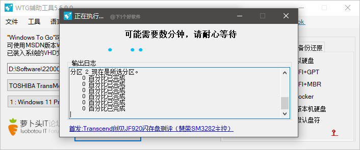 部署时间一般在 10 分左右,如果时间太久,那么你的 U 盘可能性能太低,也许不太适合做 Windows To Go 启动。