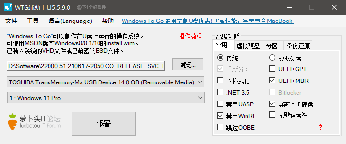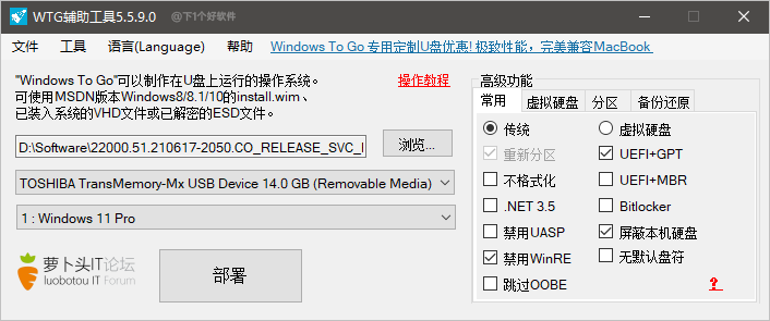 3.接着打开「WTG辅助工具」选择 Windows 11 镜像、选择你的 U 盘,选择系统版本,专业版、企业版,看你自己需求选择了。