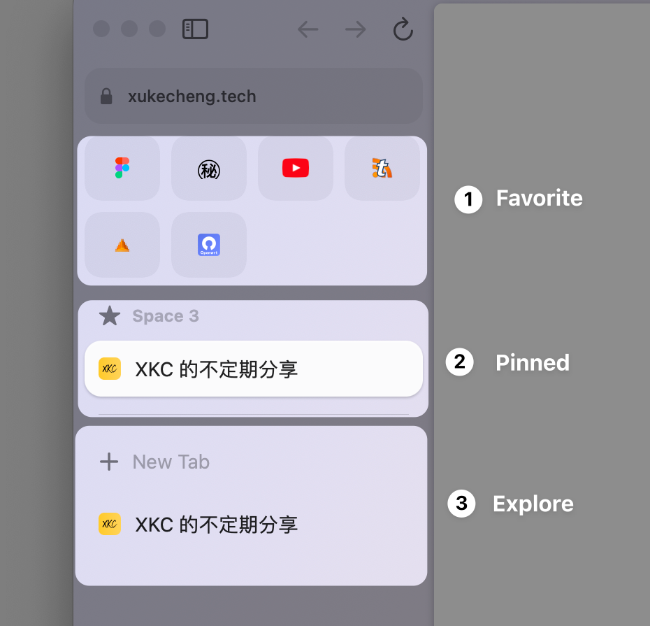 标签页系统,标签页分成了三个区:Favorite(类似于日常使用浏览器时书签)、Pinned(每一个 Space 里的固定标签页)、Explore(每一个 Space 里的临时标签页,会被自动清理)。
