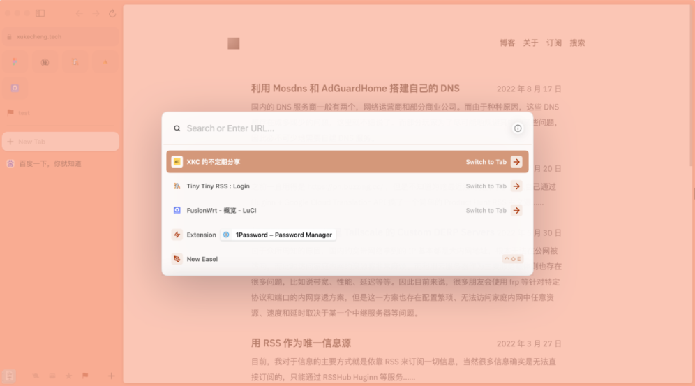 New Tab 操作也被更换为下面这种形式,用户可以更加快速地打开标签页或进行搜索,类似 Spotlight 的快速启动器。