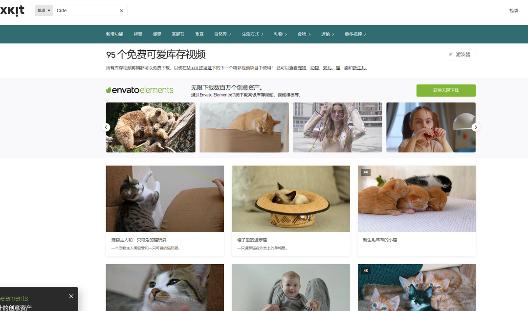 搜索视频资源需要使用英文来输入,比如输入关键词“cute”,相应的视频素材就会为你呈现出来。