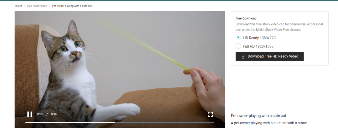 Mixkit 网站的视频素材拥有超高清晰度,在视频素材页面点击“Download Free”就可以免费下载啦。