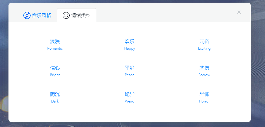 寻找免费商用的音乐也很简单,在顶部搜索框中输入你想要音频的关键字即可。也可以点击“音乐助手”按钮即可从音乐风格和情绪类型两种方式搜索。