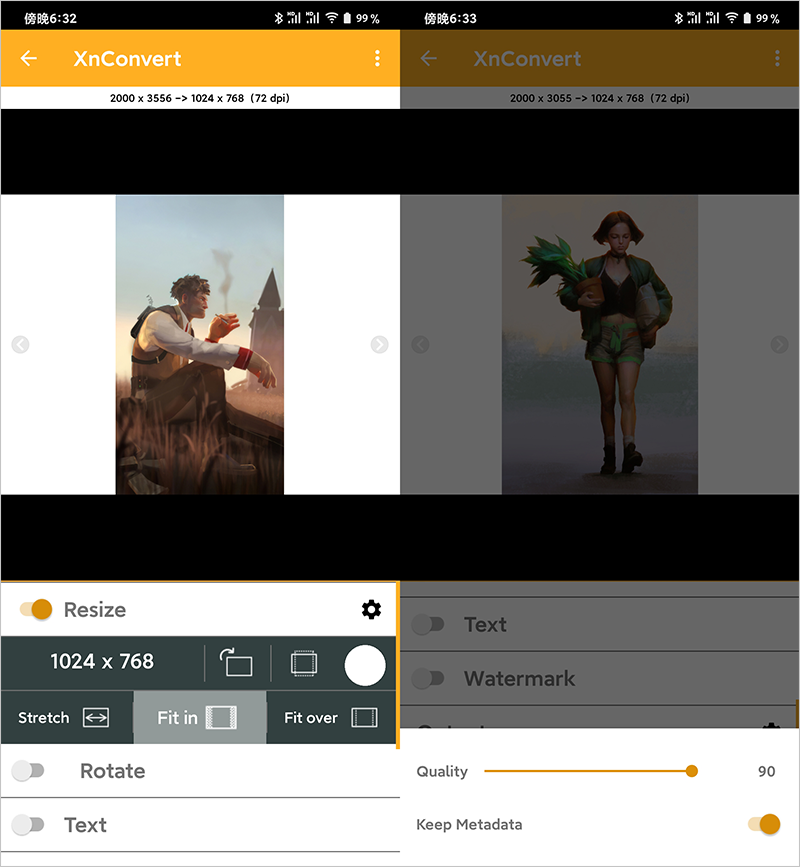 安卓版的「XnConvert」同样完全免费无广告,不过暂时没有中文版,好在使用起来也很简单,批量选择你要压缩转换的图片,然后设置下尺寸、格式、质量等参数。功能方面没有电脑端的那么强大,但也可以满足日常的图片压缩处理了。