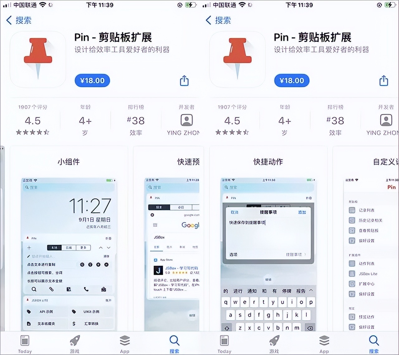 利用 iOS 通知栏实现了丰富的扩展功能,如复制历史、搜索、翻译、分词、打开链接、抓图、启动应用、预览网页等。