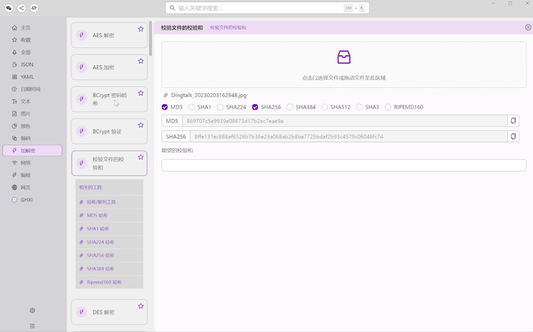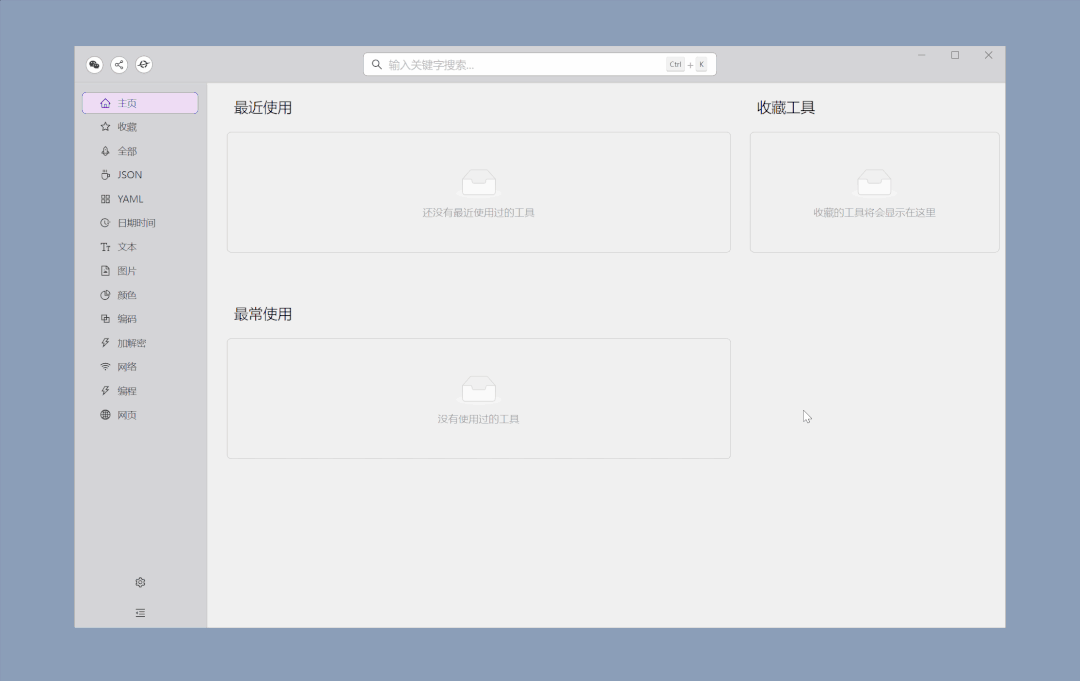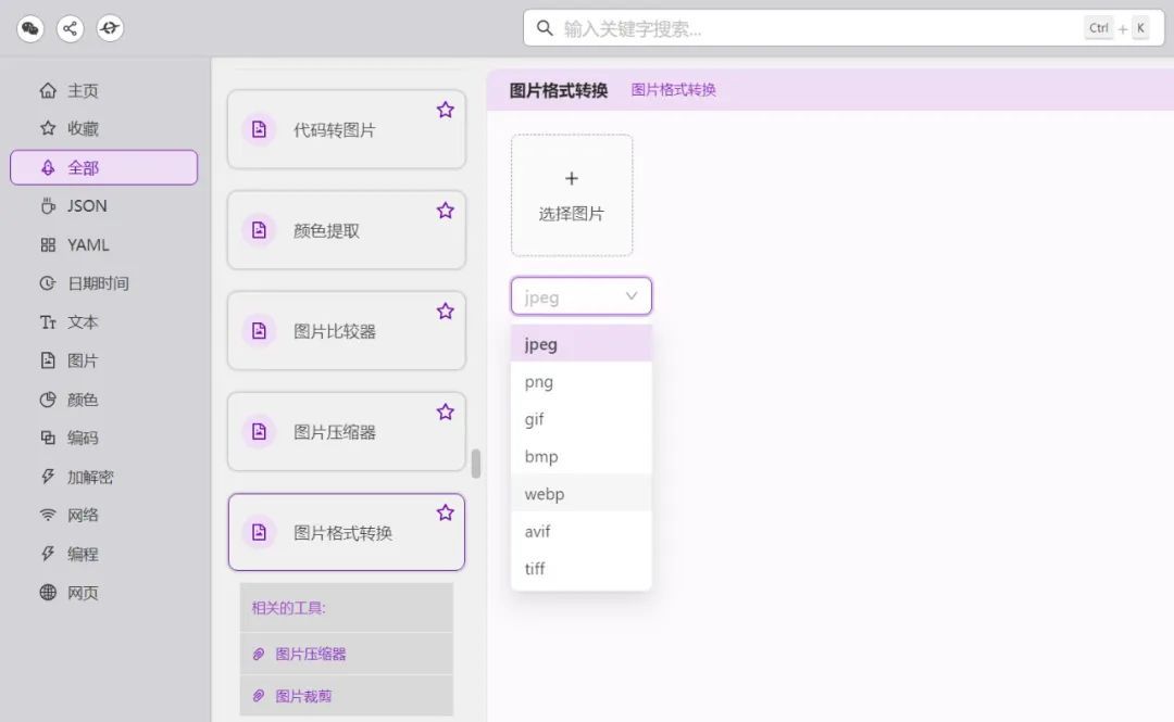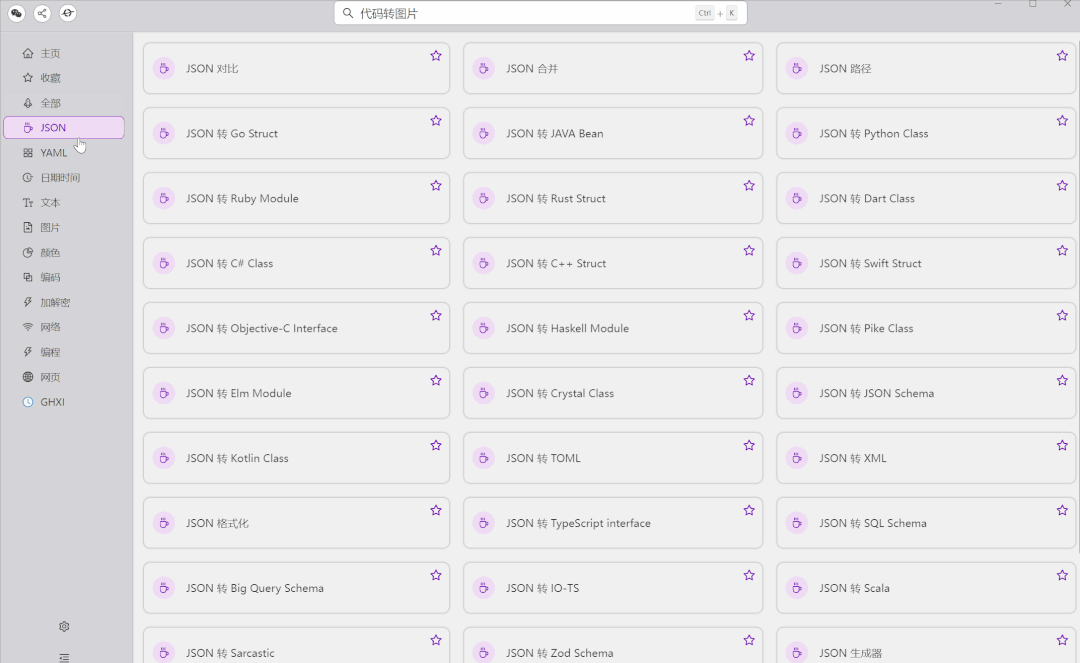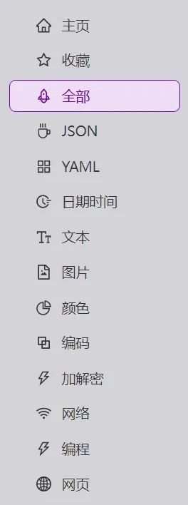 所有的工具被分成了11个大类:JSON、YAML、日期时间、文本、图片、颜色、编码、加解密、网络、编程、网页。