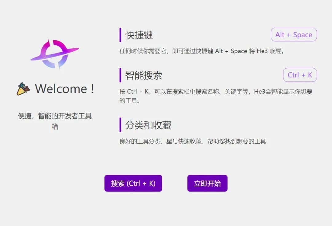 He3工具箱界面简洁、美观大方,内置超过200种实用工具,支持个性化首页定制你的常用工具页面,可以使用快捷键快速唤起并搜索,最主要的是,He3工具箱支持Windows、Mac和Linux,完全免费无广告!