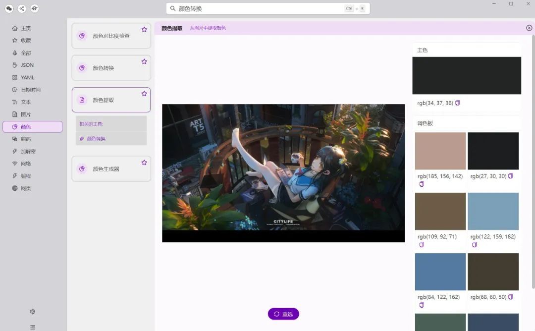 如果你在打开He3工具箱界面之前,剪贴板里面是有内容的,那么在主页上就会出现你可能会用得上的工具,如果是色值就会出现色彩数值转换工具,如果是链接就是处理链接相关的工具,这样就方便了不少。
