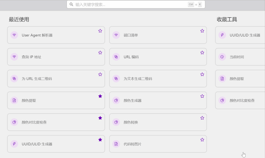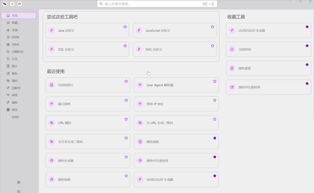 光是随便一举例就是一大堆,这么多功能自己找也是比较麻烦的,所以用过的工具会显示在主页,下面的常用分栏会根据使用次数自动排序,右边是主动收藏的工具。另外值得一提的是:搜索框支持相似关键词匹配和模糊匹配。
