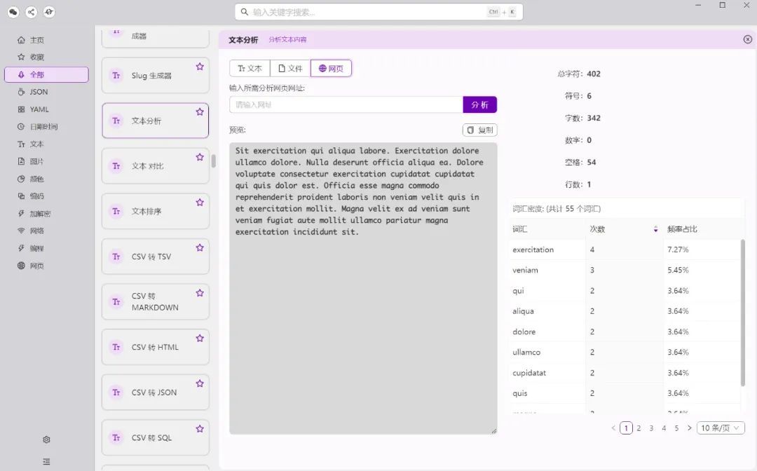 这些分类下包含了许多小工具,像是JSON格式化及转换成YAML/XML/Javascript/CSV、正则表达式测试、IP信息查询、时间戳转换、代码对比、进制转换、编码解码、加密解密等等。