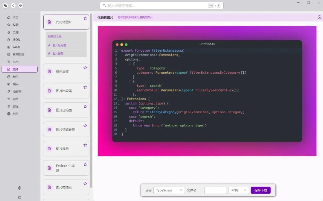 另外,喜欢软件的朋友多多少少都有过想学代码的想法吧,这里还有一个代码转换成图片的工具,让你在学习和想要分享代码片段截图的时候更美观。