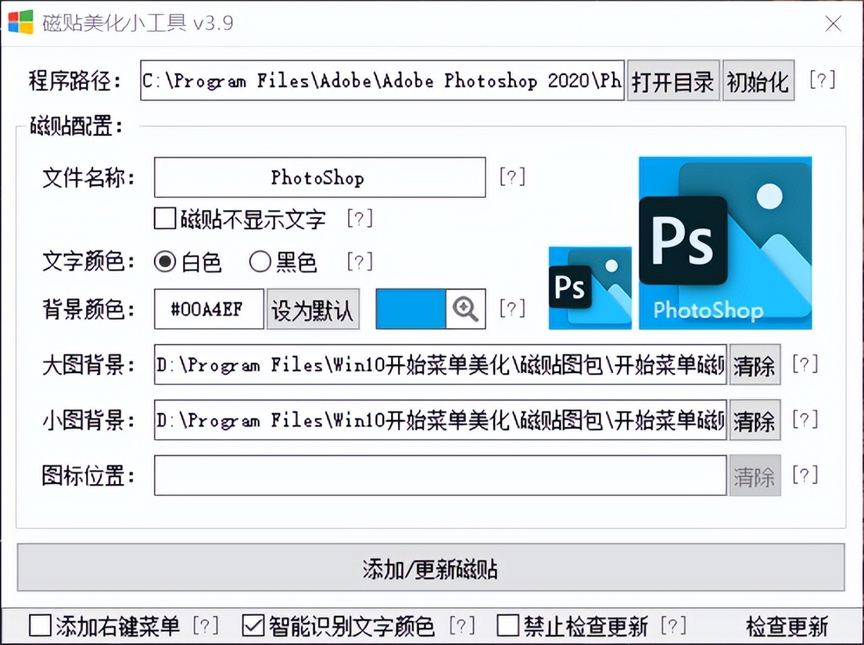 下面雷锋哥用的是「磁铁美化小工具」软件,使用上很简单,把你想Pin到开始菜单的软件快捷方式拖放到”程序路径”。再把图标也拖放到”路径”里面,其它文字名称、颜色都可以根据自己来自定义。然后点击 “添加/更新磁贴” 就会生效了。