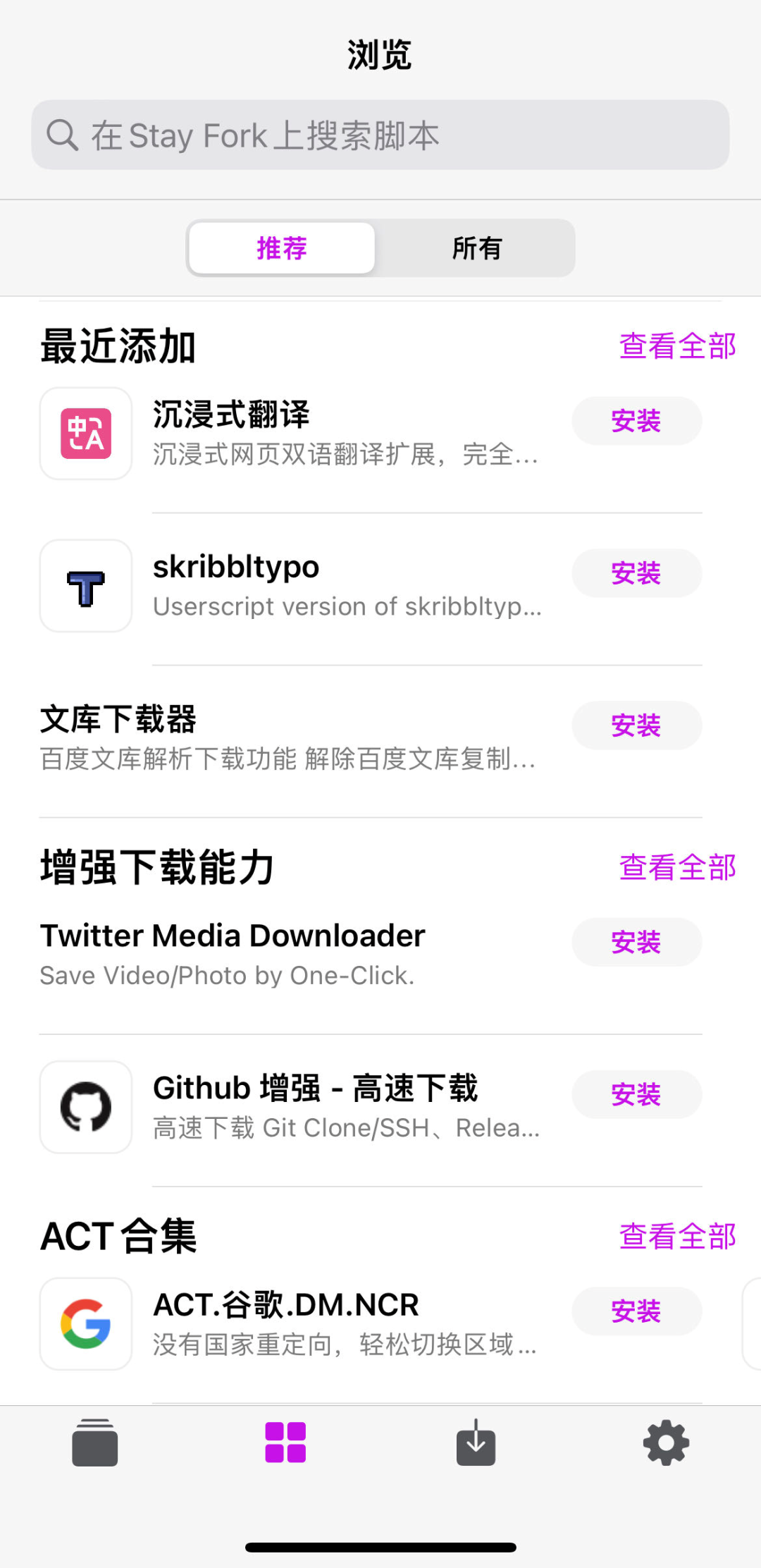 Stay 激活之后的第二步就是安装扩展,软件提供了一部分原生脚本,去广告脚本、解析会员视频脚本、文档下载脚本这些都有,全部可以免费安装。