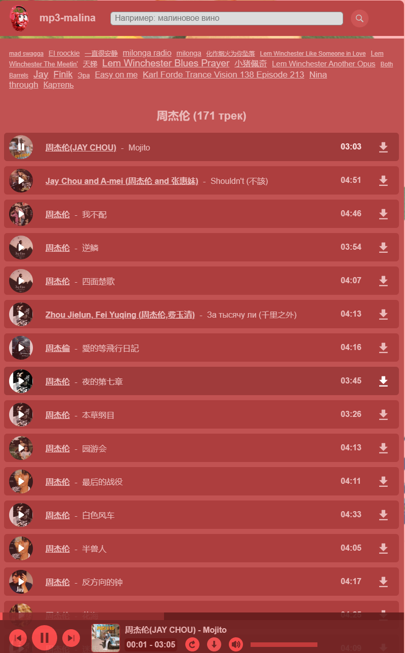 而这一期再安利一个俄罗斯的音乐下载网站:「MP3 malina」,虽说是俄罗斯出品的网站,但支持中文搜索,输入音乐 + 歌手名大部分的歌曲都能搜索到,可在线播放,也可下载。