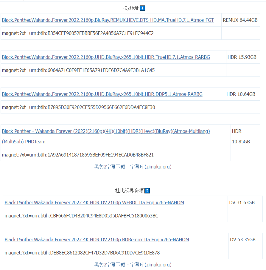 当然对应的体积就是非常大的,一部电影就是十几 GB,或者几十 GB,主要都是免费的磁力链接、迅雷云盘下载,并且可以下载字幕,部分资源还有提供阿里云盘、夸克网盘、百度网盘链接。