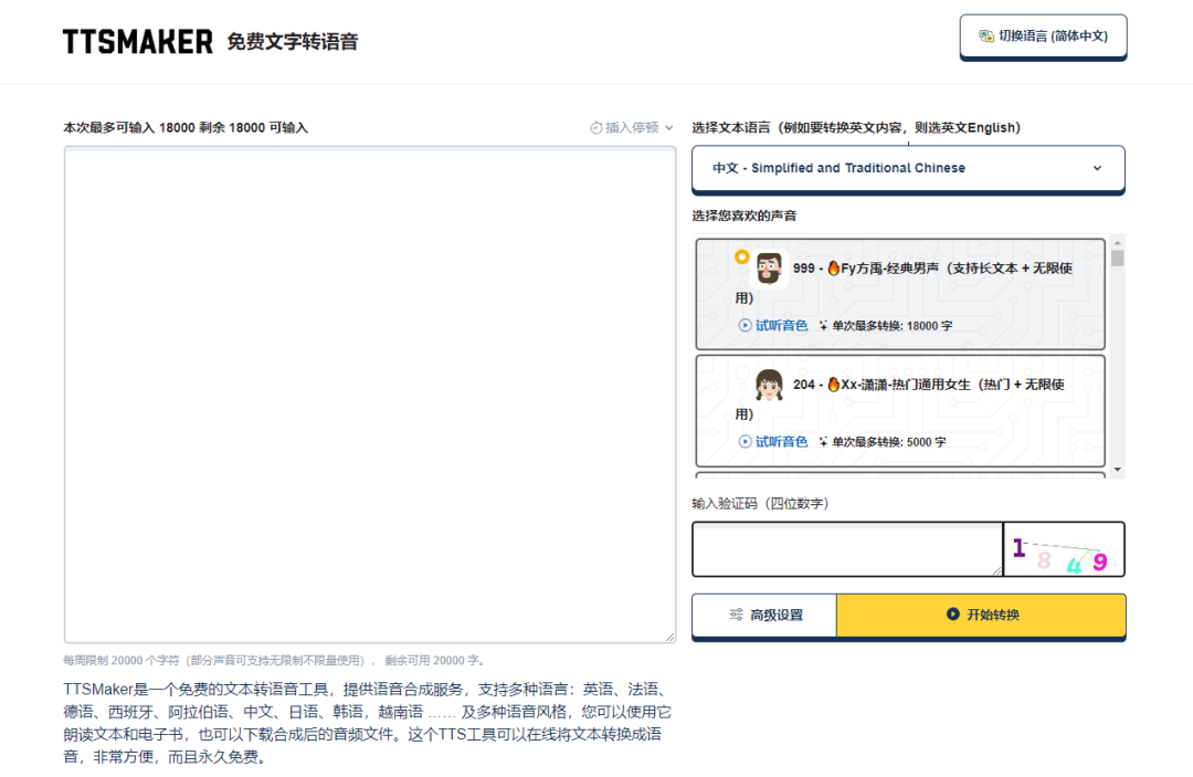 一个免费的文本转语音工具:「TTSMaker」,提供语音合成服务,支持多种语言:英语、法语、德语、西班牙、阿拉伯语、中文、日语、韩语,越南语…… 及多种语音风格。
