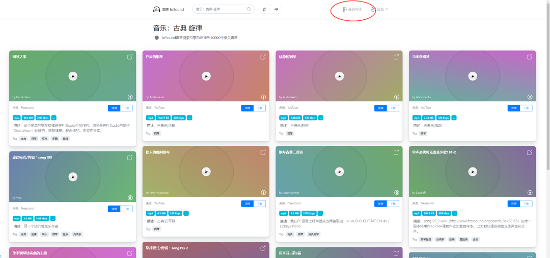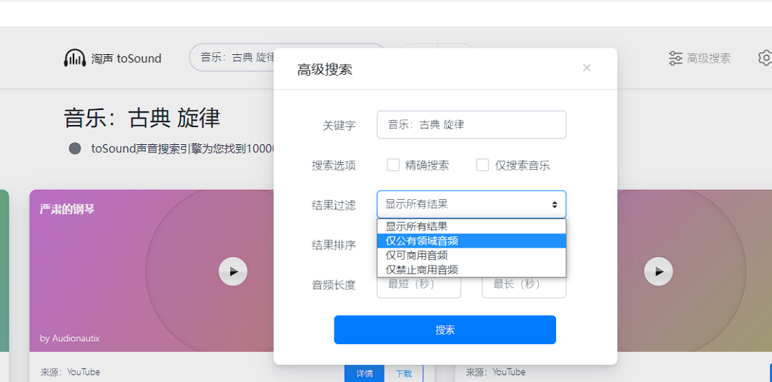 进入搜索结果页后,点击“高级搜索”在筛选过滤中选择“仅共有领域音频”后搜索的都是免费商用无版权的音乐啦。
