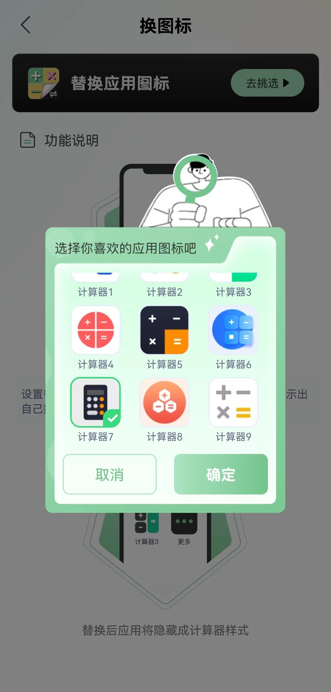 可以将原有图标更换为计算器样式,并且应用名称也会一起改变,手机桌面完全看不出装有应用隐藏软件。