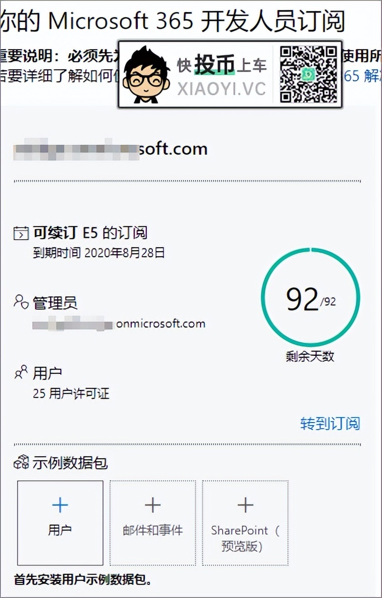 注册 E5账号 好处就是你是管理员身份,不再担心资料被删,缺点就是 E5账号 有效期只有92天,到期前需要续签。