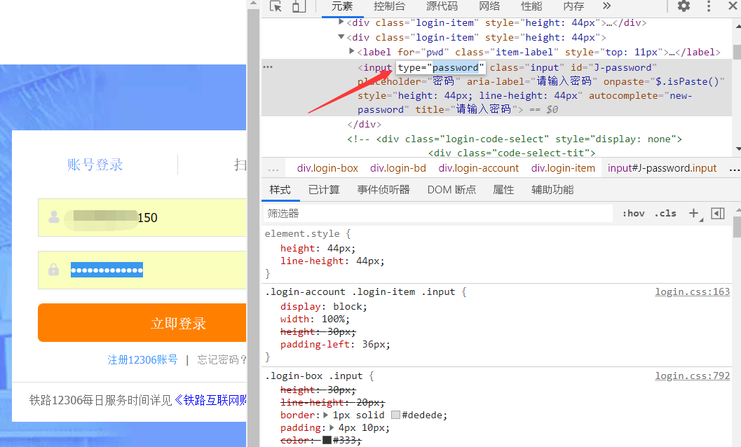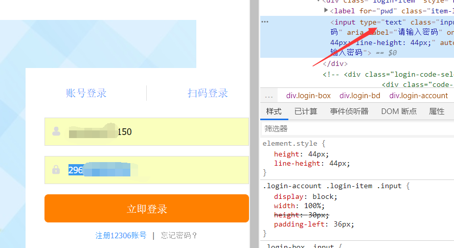 在type=”password”这里双击「password」可以对其进行修改,只需要改为「text」,然后回车,密码就显示出来了。