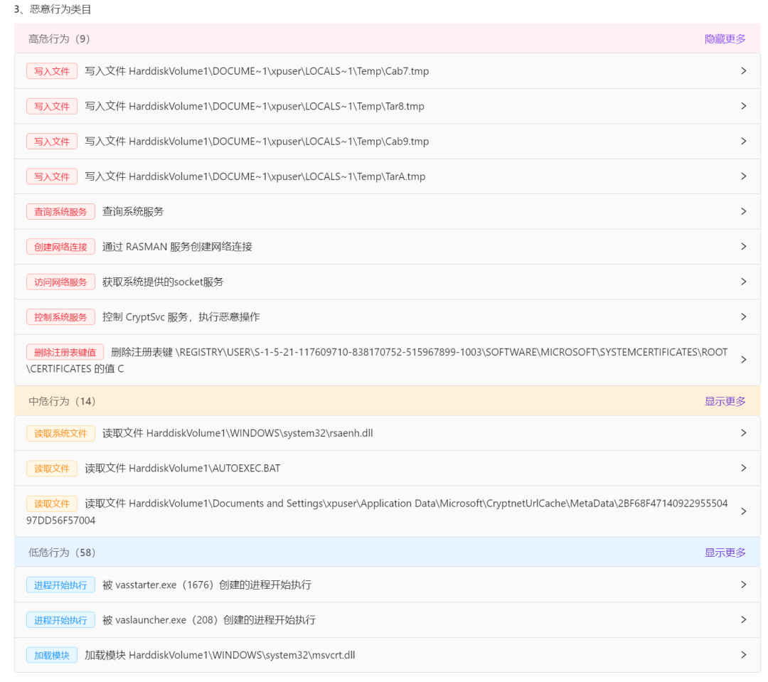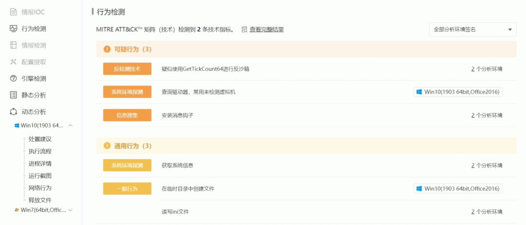 那就找一个真的恶意软件来试一下。相关的恶意行为被列出来了。