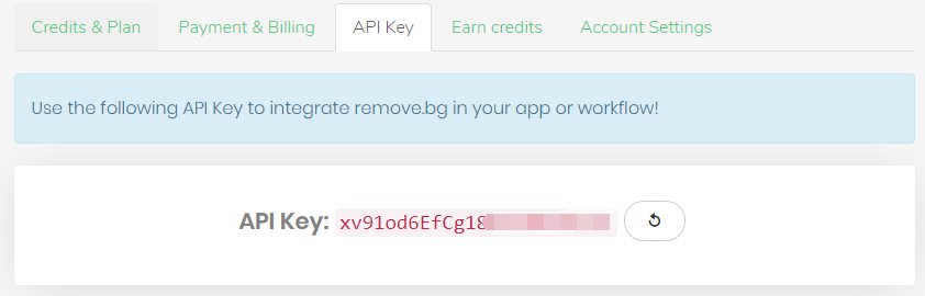 打开 https://www.remove.bg/profile#api-key 网站,注册账号获取KEY填写。