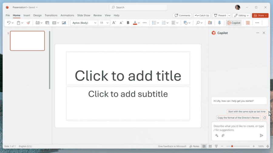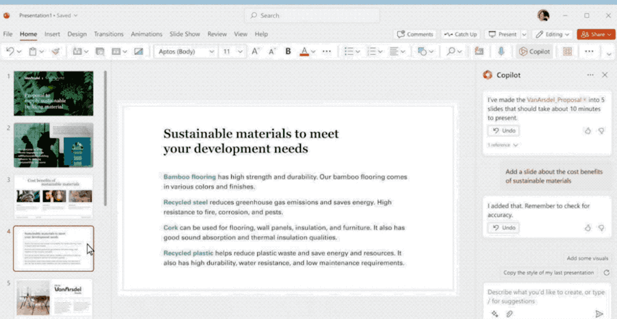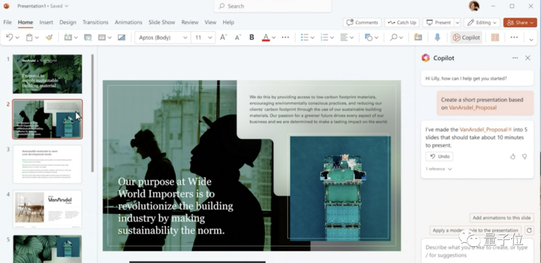 接下来可以用文字命令Copilot帮你修改:简化内容、替换你不满意的图片(可以从OneDrive云盘直接加载图片、添加动画等)。